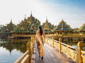タイ各地の歴史的建築物や神話の世界を再現した幻想的な空間が広がり、写真映えまちがいなし!